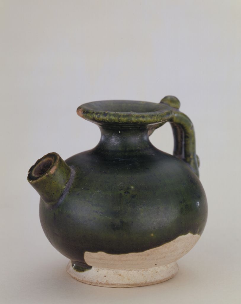 壶敞口,圆唇,短颈,扁圆腹,平底。肩部一侧置短流,对应的一侧有连于口与肩的柄,柄上下端各有一圆形装饰。施釉不到底,露胎处呈白色。