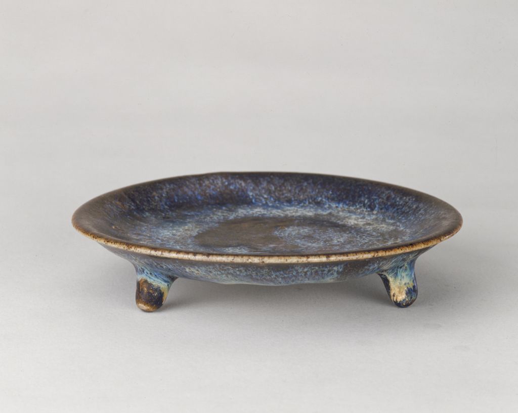郏县窑黑釉蓝斑三足盘,唐,高2.9厘米,口径15厘米,足距10.2厘米。