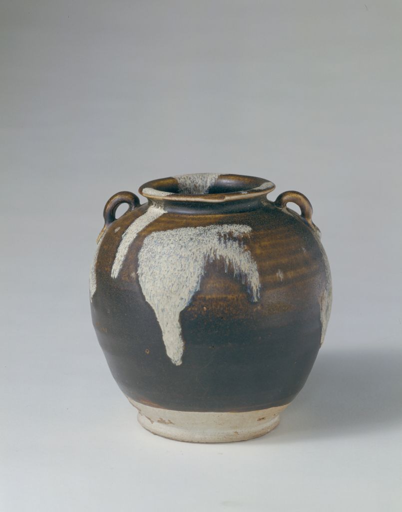 此罐口部外撇,短颈,圆腹,平底。肩部对称置半环形系。罐身施黑褐釉至近足部,上饰月白色斑块。此为唐代著名的花瓷罐。