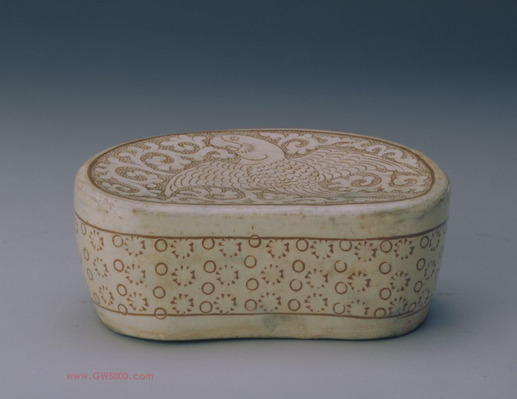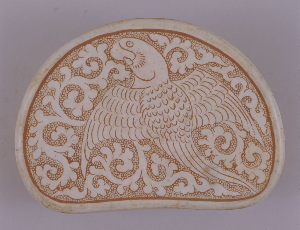 纹饰线条细腻流畅,鹦鹉形象栩栩如生。此枕当为河南密县窑的产品。古陶瓷纹饰之一,又称珍珠地划花。河南密县西关窑于唐代首创,系仿唐代金银器錾花工艺之纹饰制作而成,宋代此种纹饰较为流行。河北、河南、山西都发现有烧制珍珠地划花器物的瓷窑。如河北磁州窑,河南密县窑、登封窑、鲁山窑、宝丰窑、修武窑、新安窑,山西介休窑、交城窑等,珍珠地是我国北方瓷窑普遍使用的装饰方法之一。