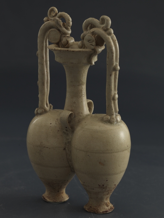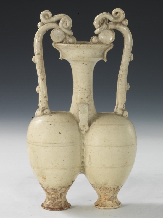 White glazed vase with conjoined bodies, single neck and dragon handles