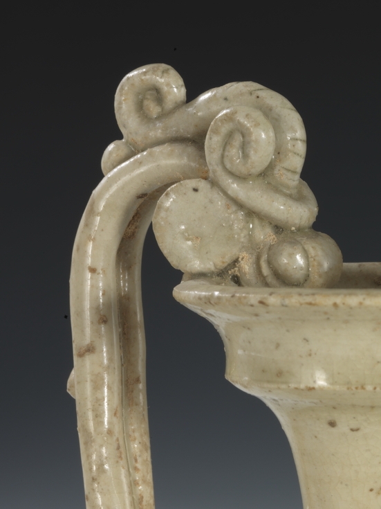 天津博物馆藏有的隋白釉双龙柄连腹传瓶,瓶高18.5厘米 ,口径5.2厘米 ,底径2.5厘米, 腹径11厘米。盘口,单颈,双腹相连,连接处有两个环形系。肩左右两侧各塑一条修长的龙形柄,龙头探入瓶口内,似在贪婪地吸吮着瓶中的玉液琼浆。双龙柄为手工捏塑而成,手法简单干练,形象却生动逼真。双平底刻有铭文:“此传瓶,有並。”由此得知,这个瓶子的名称应为传瓶。“有並”又作何解呢?可以理解为此瓶瓶身双腹相连,也可理解为此瓶成双。相同造型的瓶子还有一件珍藏于国家博物馆,与天津博物馆所藏瓷瓶尺寸相若,国博那件出土于隋李静训墓,然而却无刻款,因此天博这件更显珍贵,瓶子本身透露的信息更具有直观的说服力。这件传瓶,造型新颖别致,既具北朝和隋代瓷器所特有的浑厚凝重,又不乏灵秀活泼,其线条刚柔相济,是隋代创新的器型,代表了当时白瓷制作的最高工艺水平,成为隋代稀有的瓷酒器精品。
