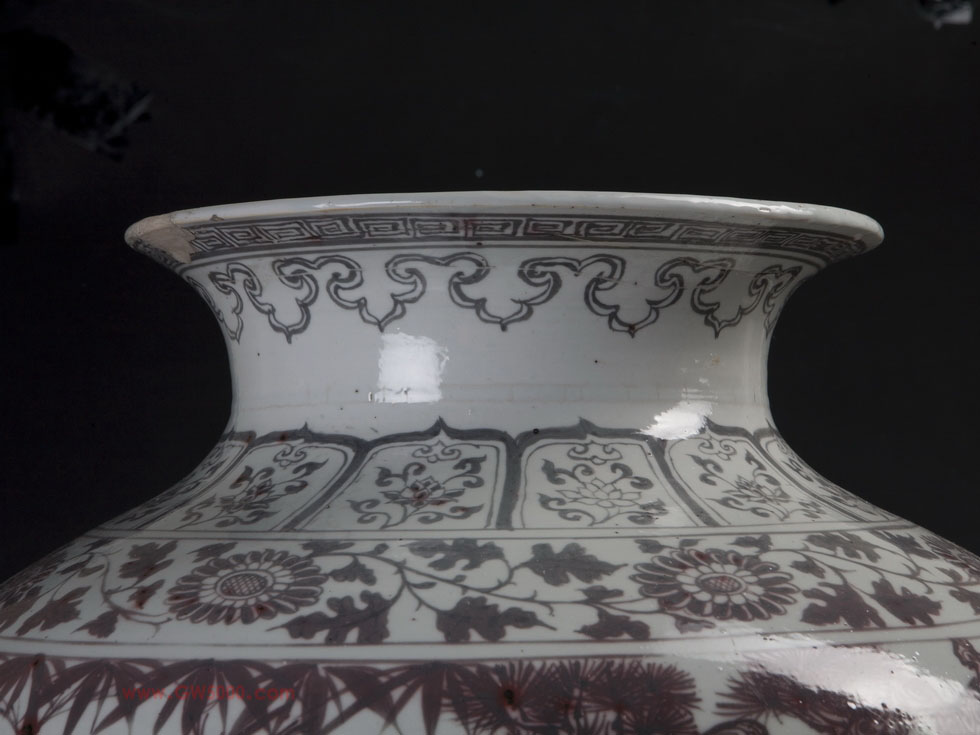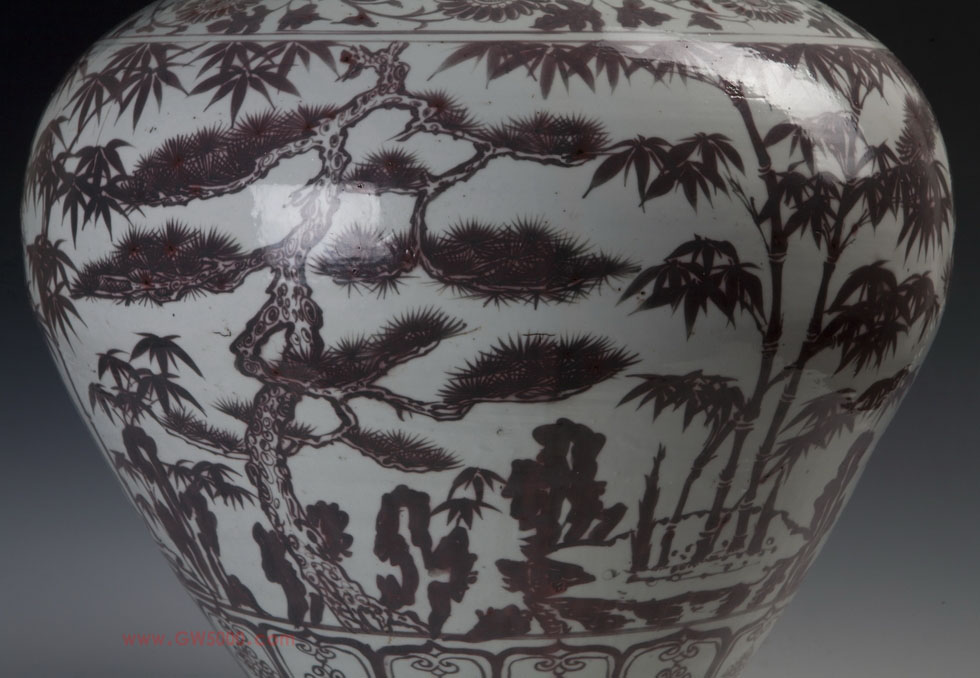 天津博物馆藏有一件洪武釉里红松竹梅纹大罐,高54,口径27,腹径45,底径24厘米。撇口,短颈,丰肩,鼓腹内收至胫部外撇,平底无釉,露火石红斑。造型和谐美观,体大而不变形。器表施亮青釉,釉面白中闪青,肥厚均匀,并有细密的气泡和微小棕眼。釉下用铜红彩进行绘画。口沿处饰一周如意云纹,颈部为变体莲瓣纹,肩部饰一周缠枝扁菊花纹,腹部以松、竹、梅环绕一周,绘“岁寒三友”图,并以山石、蕉叶加以衬托。胫部绘两组仰覆莲瓣纹,其间以回纹相隔,圈足边饰卷草纹,画面布局层次多达八层,但主题突出,主次纹饰鲜明,繁而不乱,一展元末明初多层次彩绘的独特风貌。这件松竹梅纹大罐,腹部“岁寒三友”图很有特色,其中松树铁干虬枝,倨傲不羁;梅树横斜疏瘦,潇洒倜傥;箭竹丛篁,气势森严,整个画面渗透出一股冰清玉洁的气韵。时代特征鲜明,令人百看不厌。这样的大罐上绘松竹梅纹是存世同类器中仅有的一件。加之器型硕大,釉里红发色纯正,曾被选送参加第二届《中国文物精华展》,因而称之国宝名副其实。
