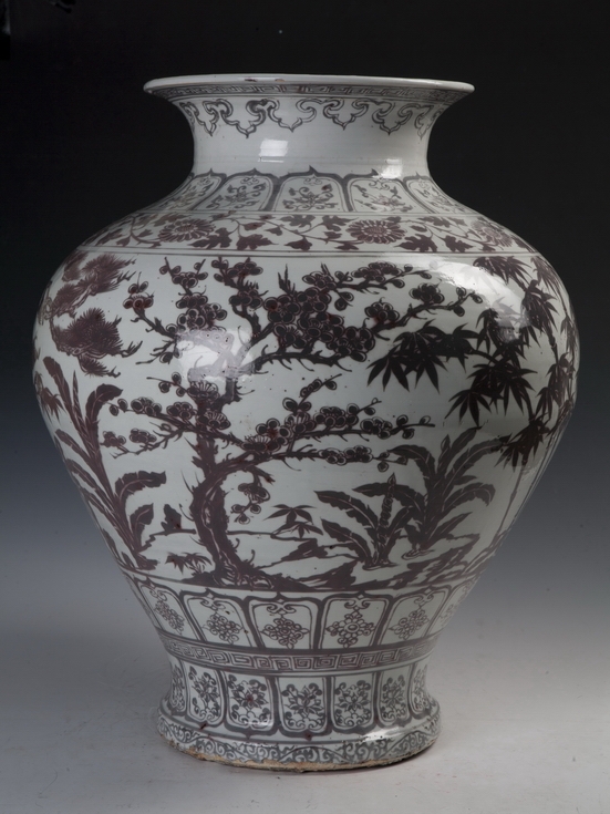 This piece is simply and solidly modelled. Copper red pigments are used in the decoration. The rim and shoulders are decorated with designs of auspicious hanging clouds, stylised lotus petals and interwoven branches. The body is painted with pines, bamboos and plum branches, complemented by the addition of porous rocks and plantain leaves. The neck is decorated with two sections of stylised lotus petal designs. The decoration has a prominent main subject, and is complex without becoming chaotic. Evergreen pines and bamboos, and the hardy plum blossoms were respectfully known by Chinese literati as The Three Friends of Winter, and were symbolic of a liberated mind. The monumental size and bright red colour of this jar make it a highly rare and valuable work.