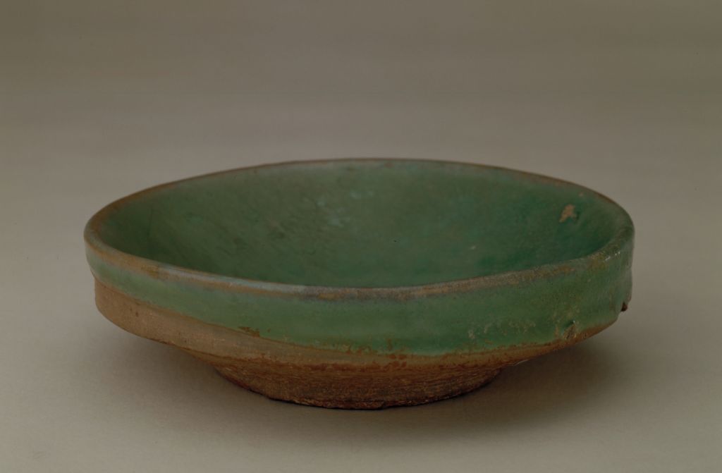 邛窑绿釉灯盏,唐,高3.7厘米,口径13厘米,底径6.8厘米。