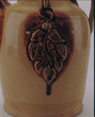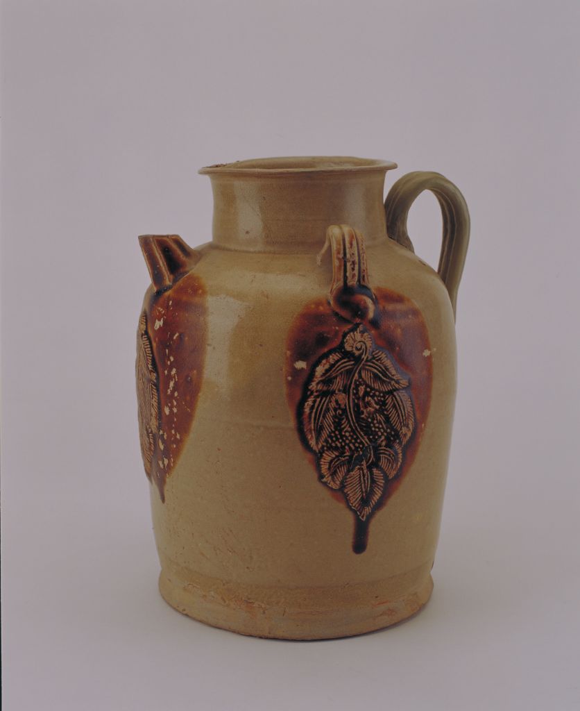 长沙窑模印贴花褐斑注子,唐,高22.5厘米,口径10厘米,底径14.5厘米。