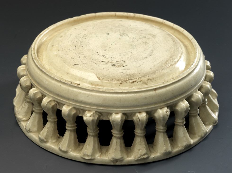 瓷砚创烧于西晋时期,盛行于南朝和唐代。早期瓷砚多是青釉圆形,仅以六或七足支撑,唐代中期以后演变为由多足组成的圈底圆形砚。有的二十多足,有的兽形足并排而立,或呈镂空状、或紧密相连。此种形制砚,又称“辟雍砚”。辟雍源于早期的太学建筑,是天子讲学的地方。东汉蔡邕的《明堂丹令论》中解释为:“取其四面环水,圆如壁。后世遂名壁雍。”汉班固《白虎通?辟雍》载:“辟者,璧也。像璧圆又以法尺,于雍水侧,像教化流行也。”此种砚在形制上,主要特点是砚池围绕砚堂周边,如辟雍环水。南北朝、隋、唐的陶瓷工匠们,模仿辟雍设计出的辟雍砚,是极富观赏价值的艺术珍品和实用文具。流传下来的唐代砚台以陶砚和石砚居多,瓷砚较少,白釉辟雍砚更为珍贵。