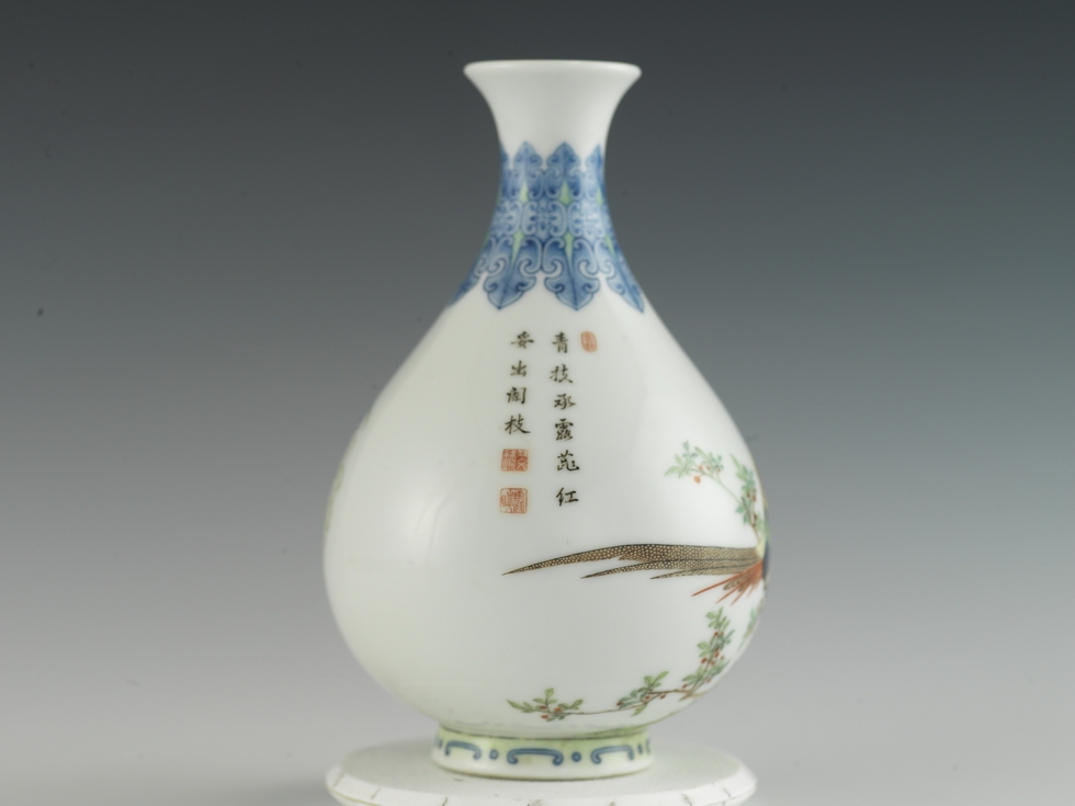 The imagery on this vase is beautifully composed. The subjects of the peonies and pheasants are symbolic of the mythical golden cockerel, filled with auspicious connotations of wealth and honour. The craftsmanship is meticulous and subtle. The painting style is derived from the Qing Palace Academy painter Jiang Tingxi. This vase combines the arts of poetry, calligraphy, painting and seals, resembling an open hand scroll.