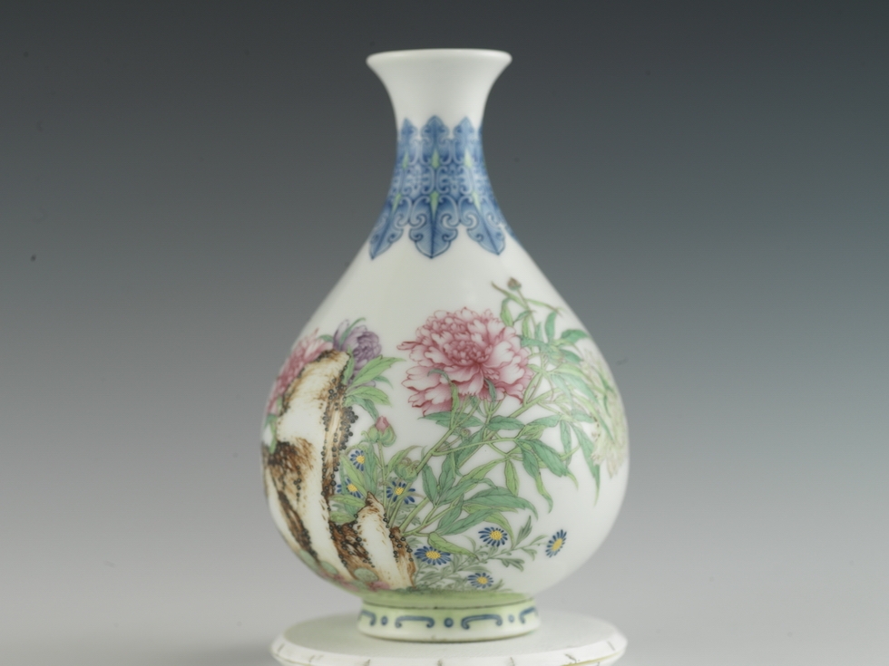 天津博物馆所藏清乾隆款珐琅彩芍药雉鸡图玉壶春瓶,是国宝级文物。高16.3厘米,口径4厘米,底径5厘米。小撇口,长颈,腹部下端丰满,圈足。瓶胎质细腻洁白,胎体轻薄,釉面莹润如玉,上用珐琅彩绘画。颈部用蓝料彩绘上下两组蕉叶纹,腹部珐琅彩绘芍药雉鸡图:两只雌雄雉鸡栖身于山石上,彼此相偎,作态亲昵,周围衬以芍药花及秋季花草。空白处墨彩题诗:“青扶承露蕊,红妥出阑枝。”引首朱文“春和”印,句尾白文“翠铺”朱文“霞映”二方印。瓶底赭彩四字方款“乾隆年制”。这件玉壶春瓶,构图十分精美,芍药雉鸡寓意金鸡富贵,有吉祥的含义。画工精细入微,绘画图案取自清代宫廷画家的手稿。此瓶集诗、书、画、印于一身,有如一幅展开的画卷,称之国宝名副其实。