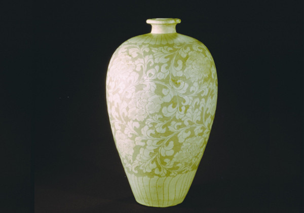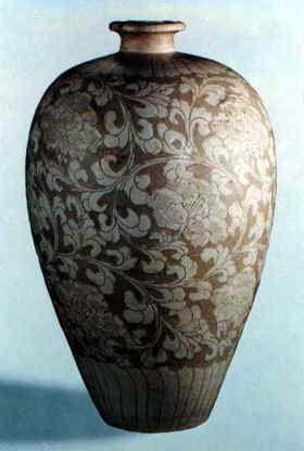 体略呈橄榄形,腹部饰剔花缠枝牡丹纹,肩部与腹下部刻菊瓣纹。花纹处施白釉,余皆露褐色胎质。所谓剔花,乃是将花纹以外的地子剔掉,使得花纹装饰更为醒目,常见有白釉剔花和酱釉剔花两种。在宋代磁州窑系中,以河南修武当阳峪窑的剔花工艺最为精湛。