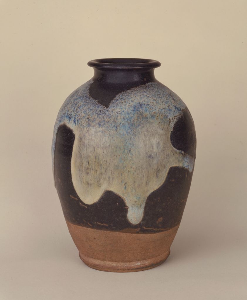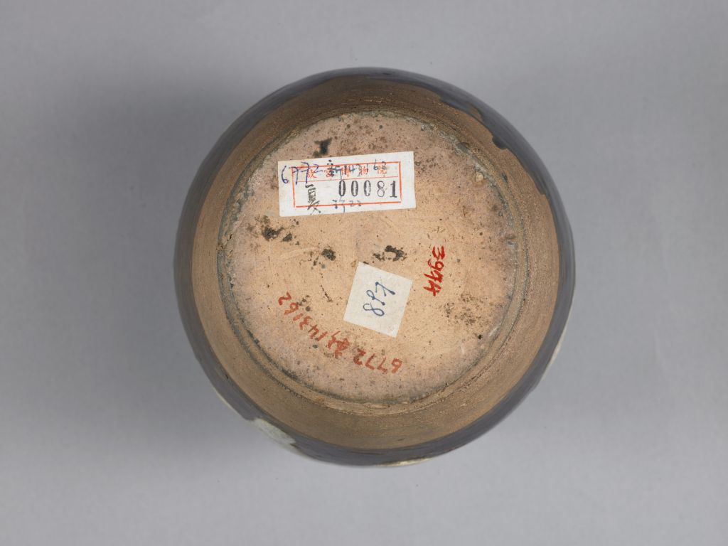 罐撇口,短颈,溜肩,腹略鼓,腹下收敛,近底处深刻弦纹一道并微撇,平底。通体施黑褐色釉,施釉不到底。罐身饰以3个连续的蓝色大斑块。