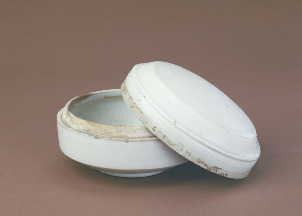 盒呈圆形,上下子母口扣合,直壁,盖顶隆起,腹下内收,圈足。胎壁较厚,胎质坚硬。里外施白釉,釉色洁白,釉面莹润。