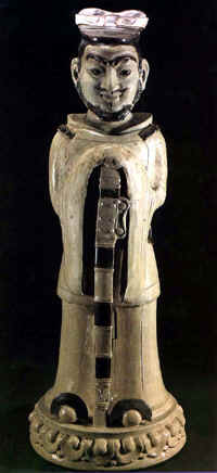 束发戴冠,双手按剑立于覆莲座上。通体施白釉绘黑彩。在中国陶瓷发展史上影响深远的白釉黑彩瓷器便滥觞于此。