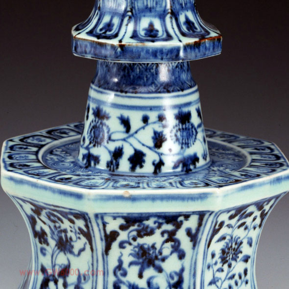 此青花花卉纹八方烛台为宣德官窑之珍品。器身分烛插、连柱、台座三层。青花纹饰,共有11层纹饰,重重叠叠,绘画精细秀丽,线条优美清晰,笔意酣畅饱满,以典型的双勾填色为多。釉面隐现桔皮纹,釉白中微微泛青,尤其是近足垂流厚积处,接近青白釉,釉质肥厚莹润。青花呈色为纯正的宝石蓝色,浓翠深沉,青花晕散而不失其浓艳,局部有下凹的黑铁斑。此青花烛台造型别致新颖,端庄规整,设计原型来自伊斯兰的金属器皿,融会中西文化之优点,为中国陶瓷史上的珍品。