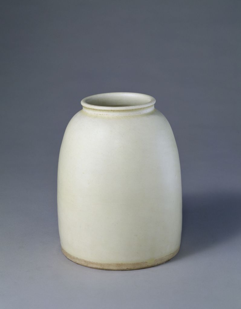 白釉罐,隋,高19.2厘米,口径9.7厘米,底径15.2厘米。