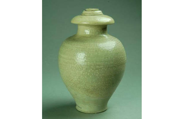 侈口,颈较短,圆肩,鼓腹,平底。上有覆钵形盖,通体施釉。