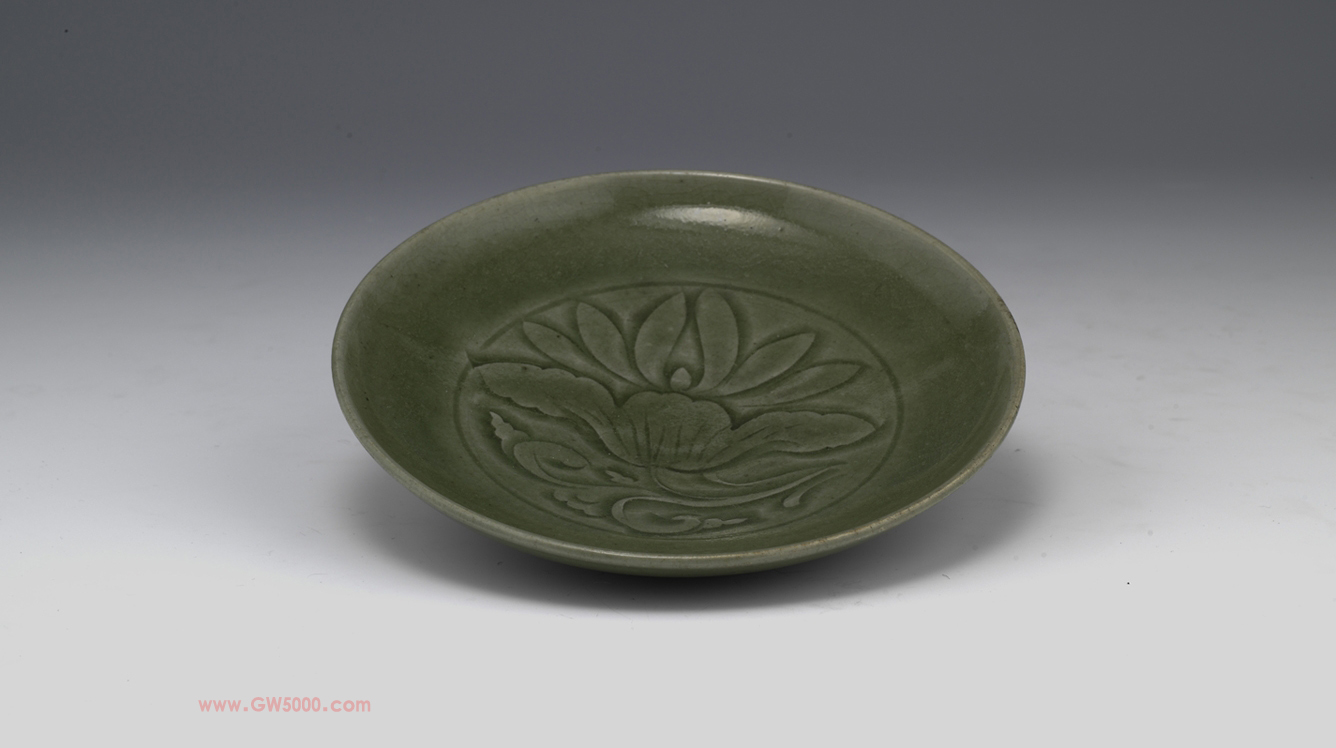 敞口,浅腹,下腹稍斜折,矮圈足。胎为黄褐色,胎质细腻。通体施青绿色釉,釉面光亮,密布有小气泡和棕眼及大小不等的隐形开片,底足露胎。盘内底刻弦纹一周,弦纹内刻有盛开的莲花和荷叶图案,刀锋犀利,外壁斜折处有一周弦纹。陕西耀州窑烧造。