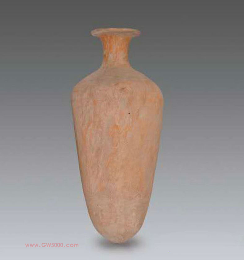 汲水用器,属仰韶文化陶器。圆唇,卷沿,高领,喇叭口,宽肩,下腹斜曲内收,尖圆底,外表饰细绳纹,颈细而长,使用时可以在上面牢固地系上绳索。汲水时,将空的尖底瓶放入水中,瓶则自动倾倒;灌满水后由于重心移动而竖起,使口自然向上,汲水十分方便省力。这种器具的出现,表明我国原始居民在很早的时候就已经懂得了重心和定倾中心的相对位置与浮体稳定性的关系这一力学原理,并自觉使用这一原理制成适宜生活用的器具。它是原始人类的杰作。