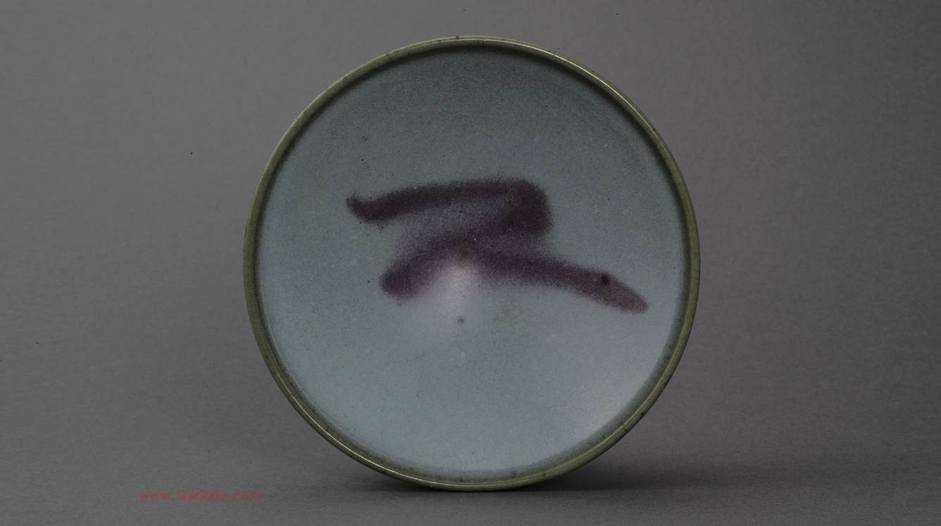 小直口,斜直壁,浅腹,小圈足。釉色月白,施釉近足。釉层较亮,上有稀疏浅隐开片和气泡,口部一周釉呈浅黄灰色,外壁近足处积釉较厚,足部有浅酱色护胎釉。碗心有呈“Z”形紫色图案。(有学者认为此器的年代应属金—元代。)