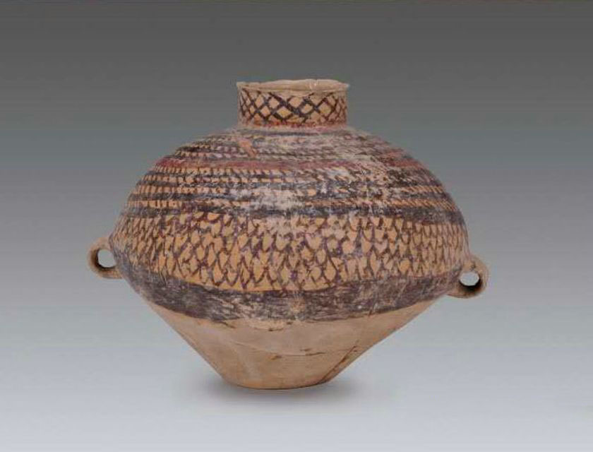 1984一1987年宁夏海原县菜园村切刀把墓地出土尖唇,侈口,偏颈微曲,溜肩,鼓腹,下腹内收,平底。腹中下部置两对称的环形耳,一侧置鸭尾状单望。泥质红陶,外施黑红相间彩。颈部饰网格纹,腹部饰锯齿纹兼带状鱼鳞纹。器物造型生动活泼,充满了生活气息。