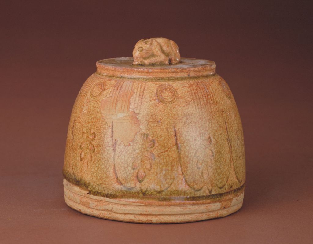 权平底,底心有一圆孔,中空,顶部饰一兔纽。器身薄施一层青釉,釉色泛黄,施釉不到底。器物顶部兔钮四周刻划一周莲瓣纹,外壁上半部分刻划六组小团花,间隔处饰篦划纹,外壁模印莲瓣纹一周,每组莲瓣内刻划一束植物纹。