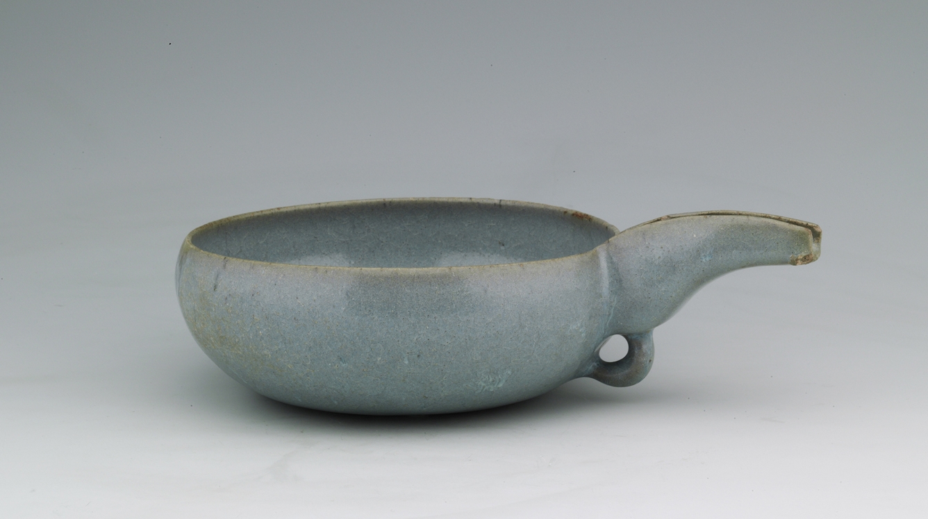 方流较长,流下一执环,敛口,扁鼓腹,平底。施天青色釉,釉层较亮,有小棕眼,密布浅隐的鱼鳞开片,内底可见“蚯蚓走泥纹”。口沿釉薄,外壁有几处流釉,呈明显的乳浊状。底部有五个支钉痕。