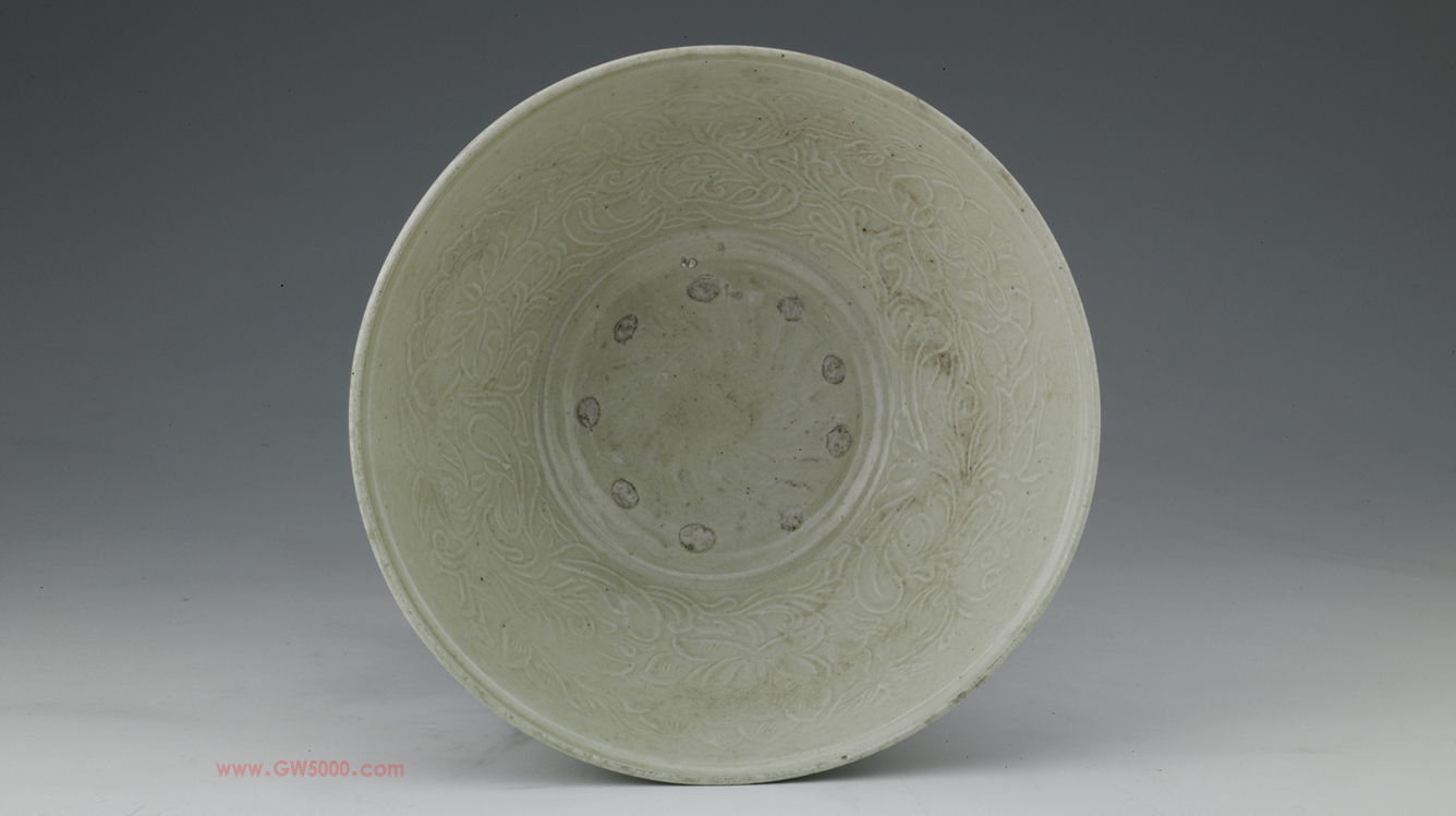 侈口,深腹,矮圈足。白胎,质细坚致。白釉泛黄,釉层较亮。碗内壁为印花装饰。碗心为放射状花纹,内壁印三朵缠枝荷花。碗内底一周有九个椭圆形支钉痕。
