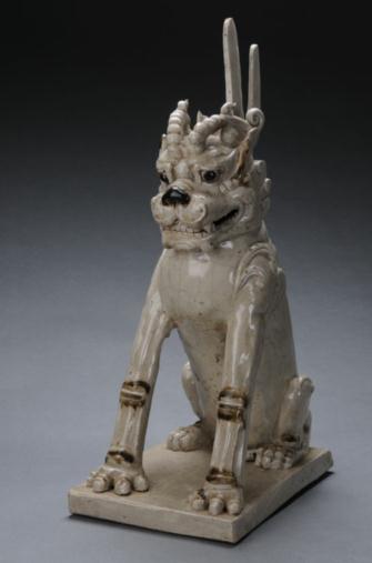 呲牙,双目圆睁前视,两耳竖起,前额有一对角,呈螺旋状向后弯曲。背有火焰形鬃毛,颈后部附一戟,前肢着地,蹲坐于底座之上。通身施白釉。眼珠、耳轮、鼻子及四肢关节处饰有黑或褐色釉彩。