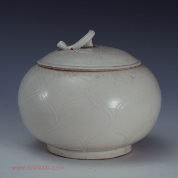 此器制作工整,胎薄而质坚,釉色温润如玉。饱满流畅的花纹更具有定窑白瓷的特征。底部有“官”字款,属于定窑器中的精品。定窑器中发现的碗、盘、瓶居多,南北各地有“官”字款的碗或盘也屡有发现,而罐仅此一件,故此器尤为珍贵。