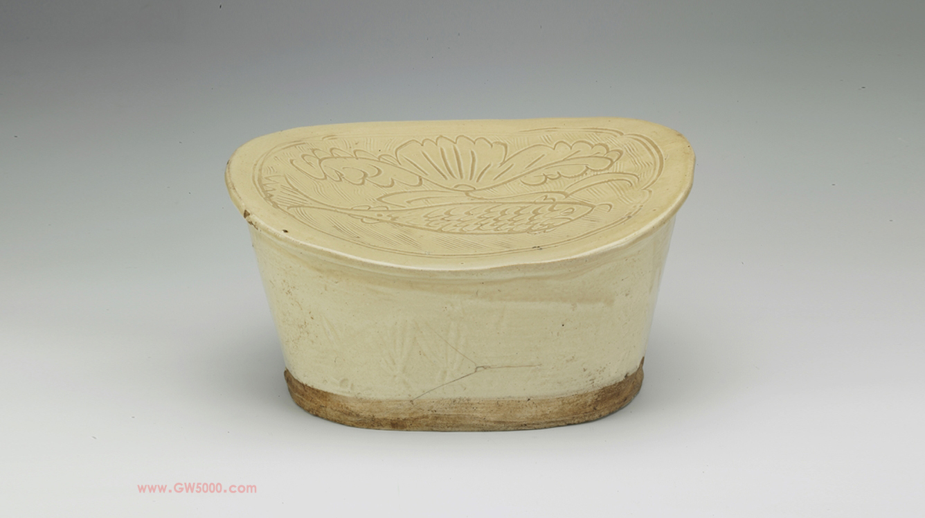 枕面近似圆角梯形,前窄后宽,中间下凹,两边翘起,一周出檐,边壁竖直外撇。平底稍出小平台,底中部有二个小孔。黄白胎,胎质较粗。施釉至出台处,釉色黄白。枕面剔刻折枝牡丹花;边壁一周分前后两栏,模印牡丹花叶。