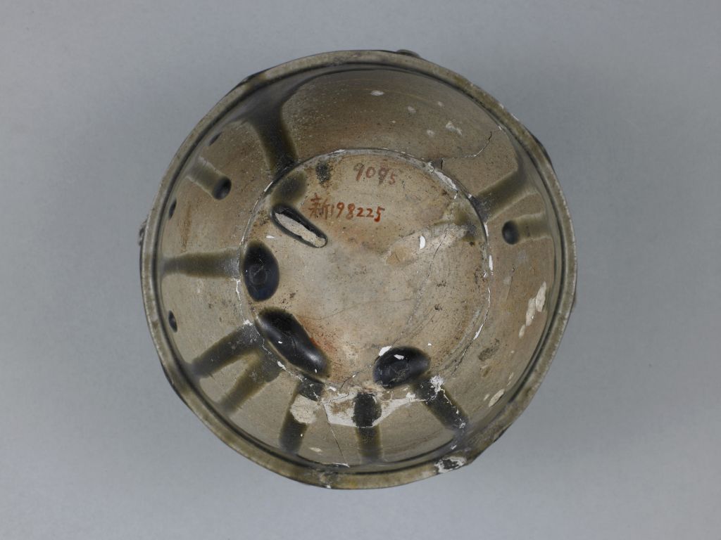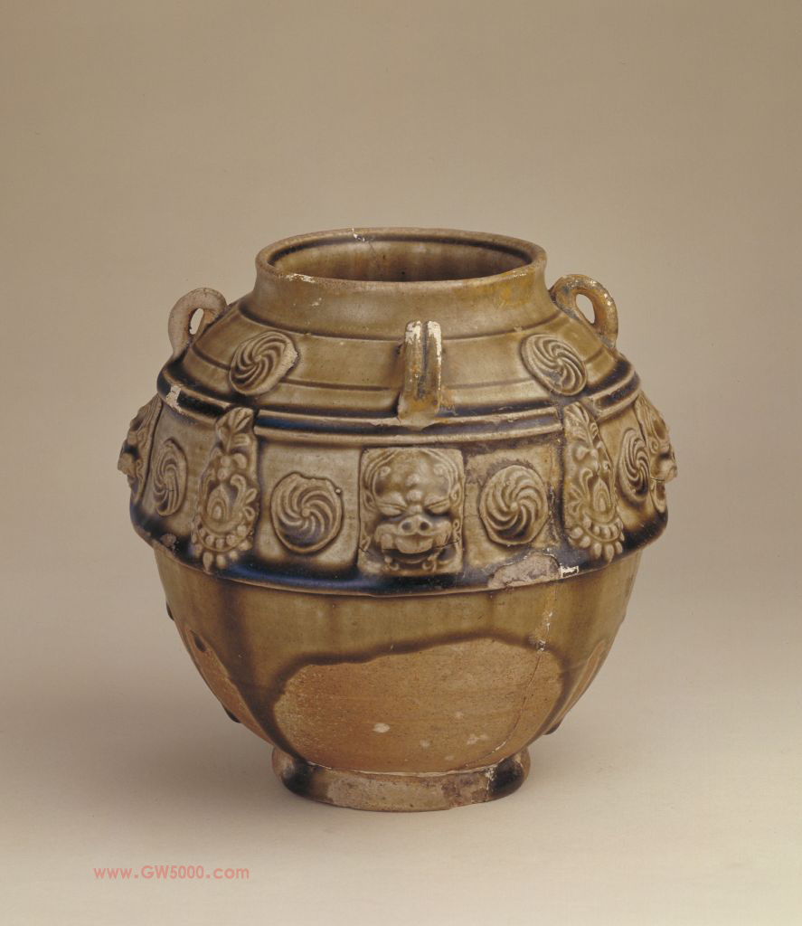 此罐采用模印贴花技法装饰,即用模子先印好浮雕状的纹饰,再用胎浆水粘贴于未上釉的坯体上,然后施釉入窑烧成。纹饰具有很强的立体效果,犹如浅浮雕,这种装饰工艺在隋瓷中极为少见。从这件罐的胎釉特征看,应是安徽淮南窑的产品。瓷器釉色名。一种含铁量在1%—3%左右,经高温还原气氛中烧成,呈现青绿色泽的釉,是中国最早的颜色釉。商周时期原始瓷器的青黄釉色是青釉的初级阶段。汉代已烧制出釉色纯正的青釉瓷器。至唐代日臻完美,被誉为“千峰翠色”。宋代的粉青、梅子青如同青玉,色泽与质感之美达到顶峰。明清之际,永乐朝的翠青、冬青(即东青),雍正朝的粉青、豆青等均色调匀净,苍翠欲滴,烧制水平已臻于炉火纯青的境界,出现了很多名贵品种。