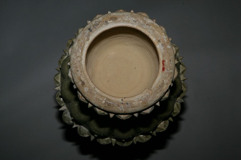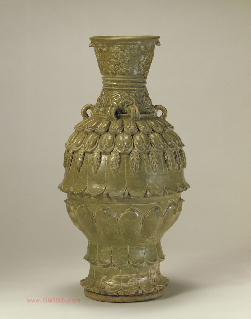 尊侈口,束颈,腹部硕大,腹下渐收,圈足外撇。釉色青绿。周身遍布纹饰,以莲花为主题。从口部到颈部的纹饰以弦纹分隔为三层,最上一层贴印6个不同姿态的飞天,中间一层饰宝相花纹,下层贴印团龙图案。颈肩部饰6个条形系。腹部装饰上覆下仰的莲瓣,上部覆莲分为三层,层层叠压,依次延伸,其中第三层莲花瓣尖向外翘起,第二层与第三层莲瓣之间贴印菩提叶一周。下部仰莲分为两层,莲瓣丰满肥硕。足部也堆塑覆莲瓣两层。
