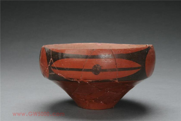 泥质红陶。敛口,曲腹下收,小平底。腹上部施红衣,绘黑彩圆点、粗线、弧三角纹组成的纹饰带。