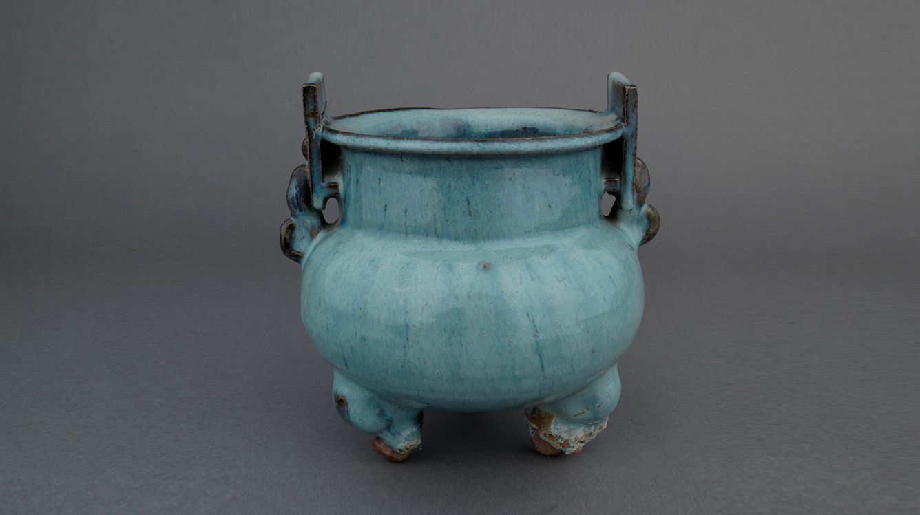 直口,平折沿,直颈,扁鼓腹,长方形镂空双立耳,耳内一螭形饰与颈腹相连,三矮曲形蹄足。通体施月白色釉,釉层肥厚,底足有积釉。器形圆浑,胎体厚重,是山西著名的浑源窑产品。
