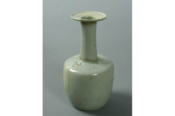 盘口,长颈,折肩,平底,器表满施天青釉,釉色滋润,底部有五个支钉痕。