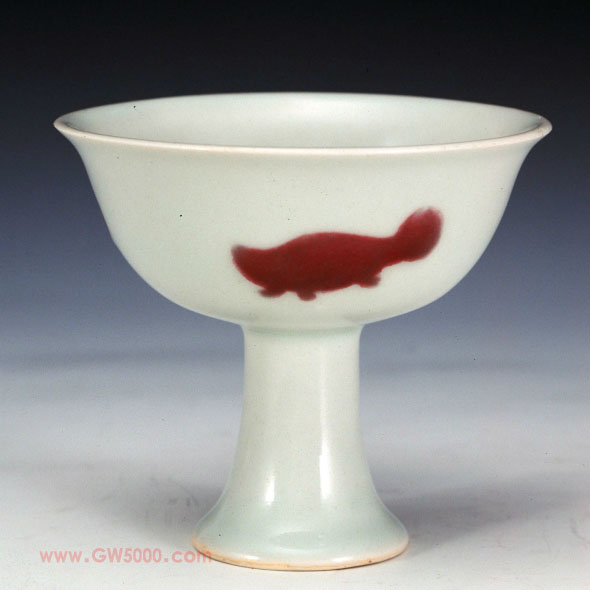 此杯口沿外撇,薄唇,平腹,高足,足沿呈喇叭口,胎体较厚,致密坚硬,触摸有润滑感。杯腹部用釉里红装饰了三条鳜鱼。胎白釉润,红白相映,显得简洁朴实,典雅鲜明,极有情趣。杯心内有青花双圈“大明宣德年制”楷书款。是明代釉里红器中少有佳作。