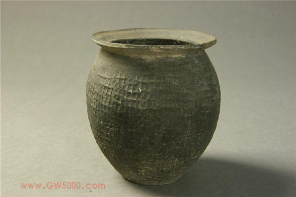 敞口,折沿,方唇,卵形腹,平底微凹,器表印有凸线方格纹。