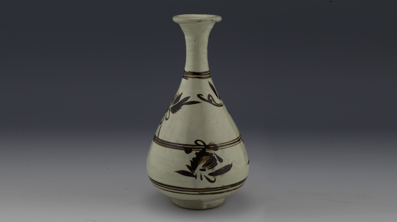 侈口,细颈,垂腹,圈足。足沿斜削,足心较平。胎为黄白色,稍粗。通体施釉,外部施釉至腹下部,内壁施釉仅至口部,釉色白中泛黄,釉面较亮。颈至腹有三组褐色弦纹,将腹部分为上下两部分,上部绘有两枝折枝卷叶花,下部绘有三朵扇形窄叶花,底部有墨书“刘山□”三字。