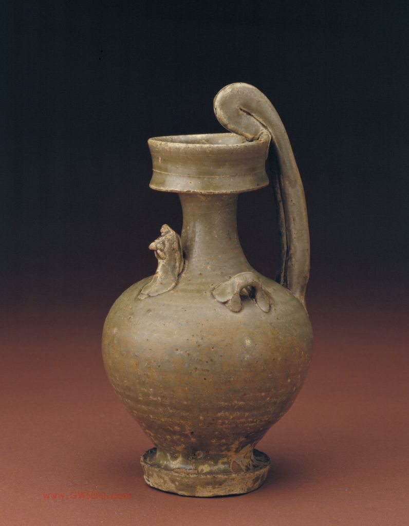 壶洗口,长颈,丰肩,直腹下敛,平底,底有支烧痕。肩部一侧雕塑鸡首流,相对一侧为一弧柄,另外两侧各饰一桥形系。肩部刻弦纹两周,并刻双层覆莲瓣纹。器通体施青釉,外壁施釉不到底,有垂釉现象,釉色青黄,有细小的开片。