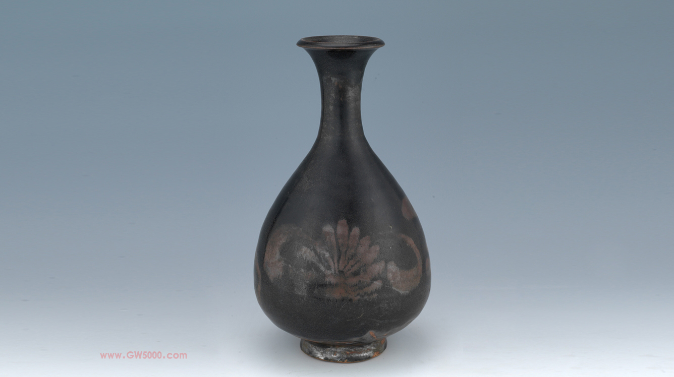 侈口,尖唇,细长颈,斜肩,垂腹,圈足。腹部绘有三朵铁锈色卷叶花。胎为浅黄色,质较粗。通体施黑釉,釉面密布银灰色“油星”,因采用醮釉方法,在腹下部近足处有蜡泪状流釉,底足有修胎刮釉痕。草叶浸在黑釉中,浑然天成,给人一种文静深沉的美感,此为颇具特色的山西黑瓷装饰。