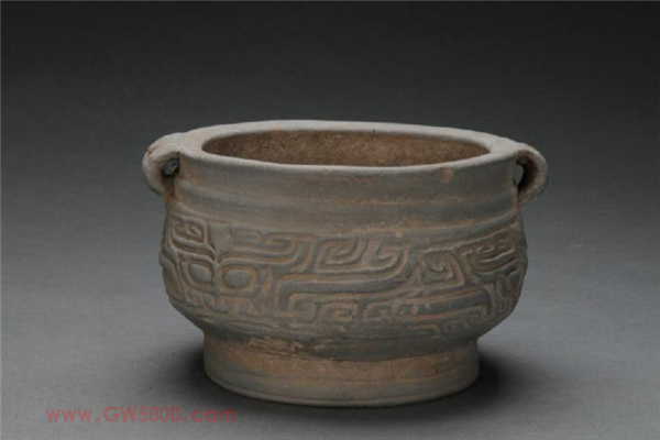 敞口,鼓腹下垂,圜底,圈足。口两侧有一对兽形半环耳,腹部有一周兽面纹带,是一件仿铜的陶礼器。
