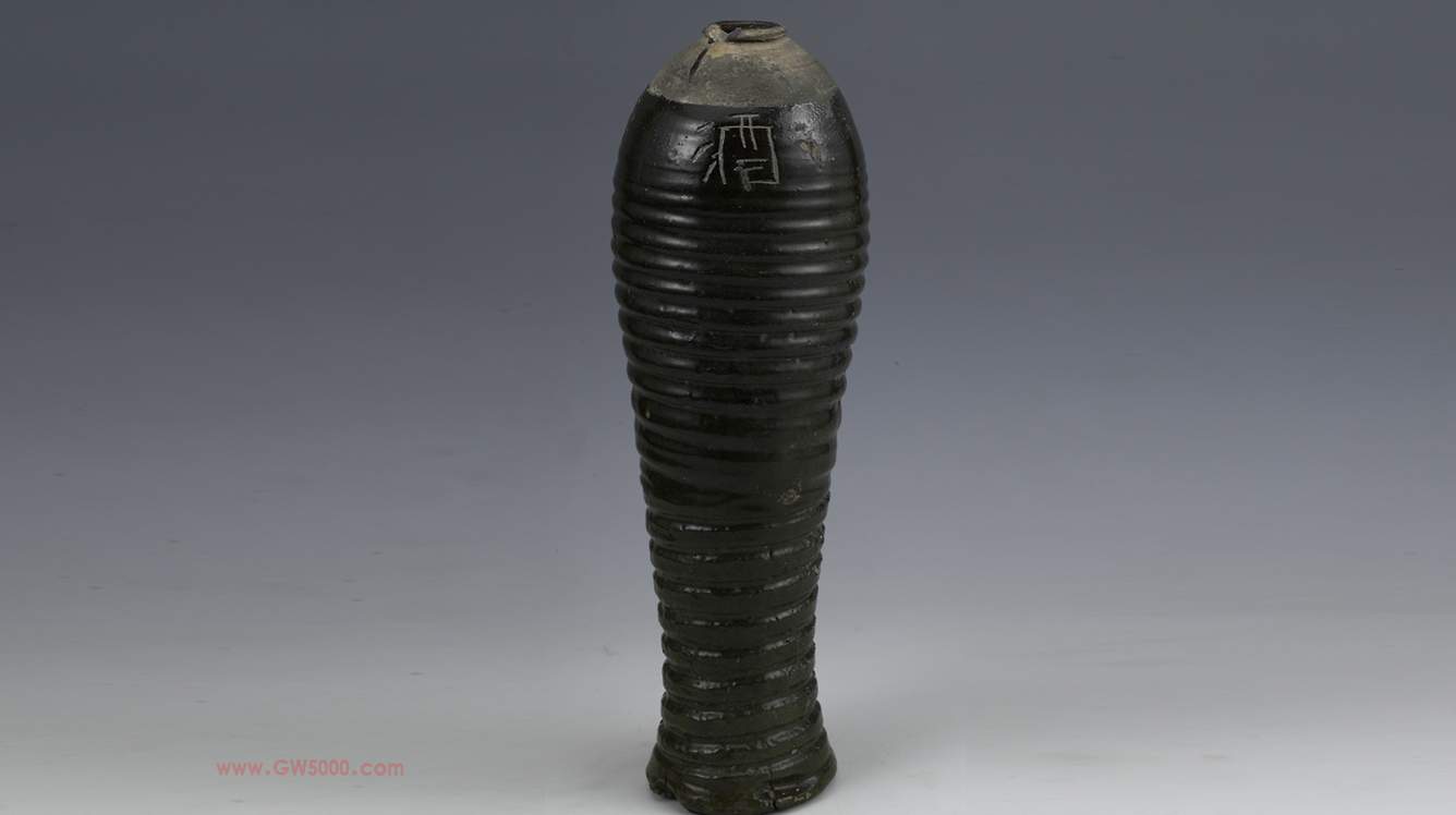 小口,溜肩,长曲腹,腹向下渐内收,下腹及底外撇,隐圈足。赭灰色胎,胎质较粗,胎体厚重。绿褐色釉,釉层较亮,施釉至足,肩部上半部刮釉。全身有拉坯时形成的较深的螺旋纹,肩部一周划写有“都酒使司”四个字。