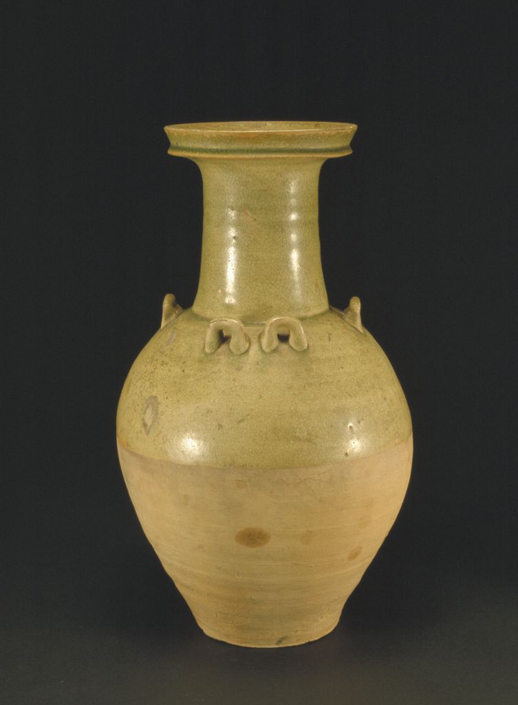 瓶盘口,长颈,溜肩,圆腹,平底。肩部十字对称分布一组单系和一组双系。内外施青釉,釉不到底,釉色青中泛黄。
