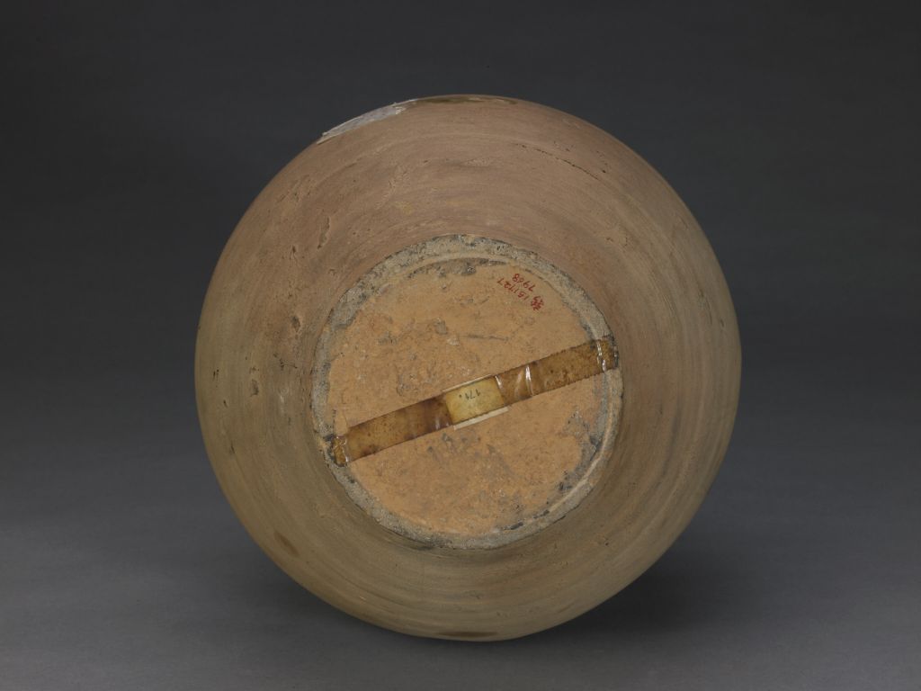 青釉六系盘口瓶,南朝,高39.4厘米,口径14.7厘米,底径11.7厘米。
