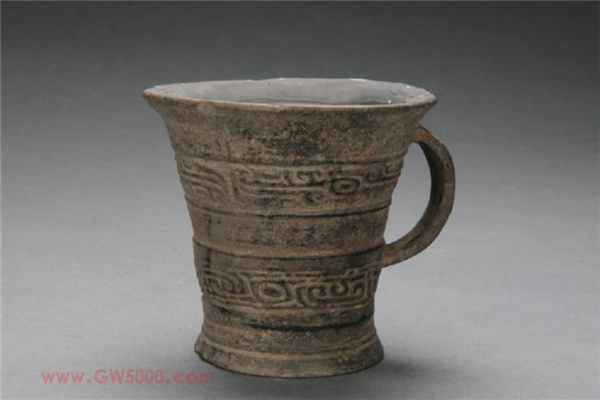 侈口,圆唇,喇叭式腹,圈足,腹侧有一半环形宽带鋬,腹部有两周二夔共目纹纹饰带。