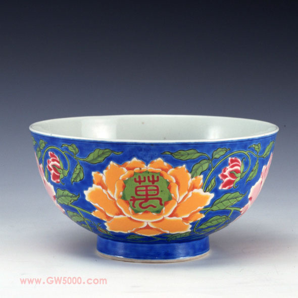 直口,弧腹,圈足。珐琅彩瓷始于清代康熙,制作方法是由景德镇烧成素胎碗,碗内及底足施白釉,碗外留涩胎。由清宫内务府造办处珐琅作彩绘,然后在红炉中烘烤而成。此碗口沿及底足边沿均有一条阴文细线,系施高温白釉和低温蓝釉的标志线。底落“康熙御制”胭脂水料双方框四字款。