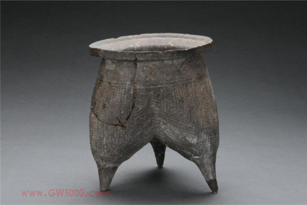 敞口,方唇,折沿,袋状腹,柱状足。口沿下方饰有八个圆圈纹及两周弦纹,腹部饰粗绳纹。