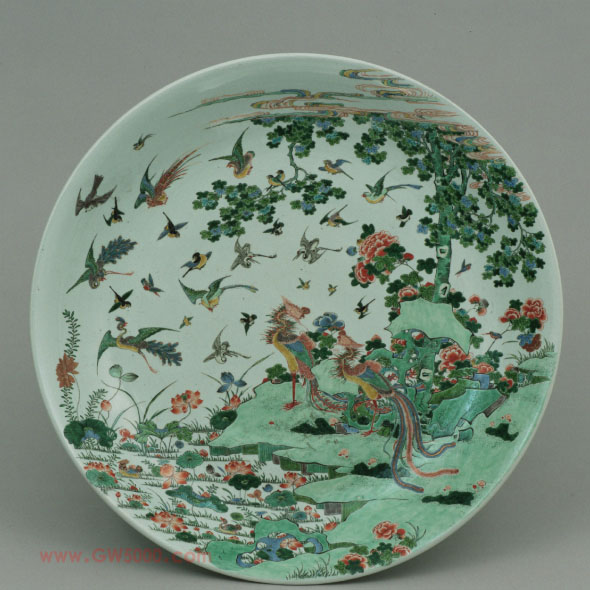 康熙五彩的大型器以民窑产品为多,这件百鸟朝凤盘亦属此类,款识,纹饰、题材、布局及底足皆具康熙器典型特征。色彩富丽,画笔工整,实为康熙民窑中之稀有精品。