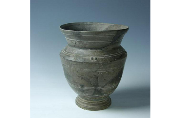 敞口,高领,折肩,深腹,圈足。通体磨光,并饰有数周凸凹弦纹,肩部有四对乳丁。