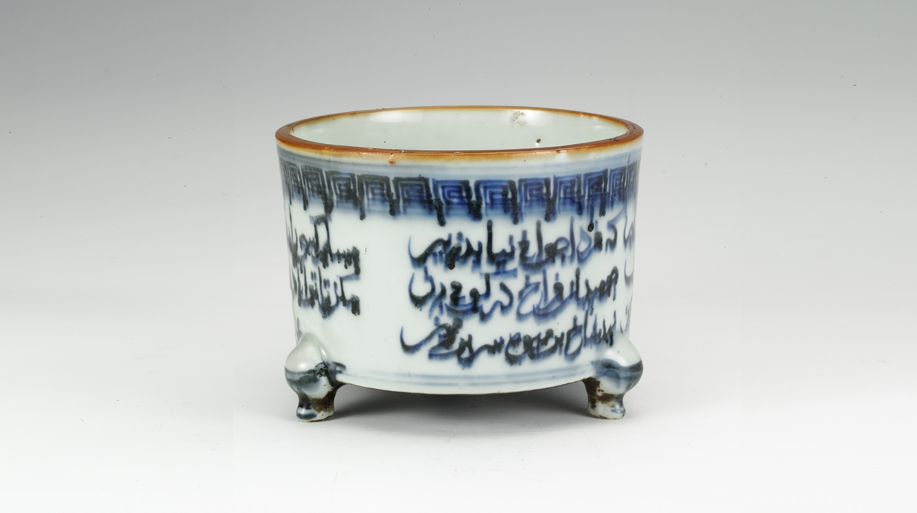 腹外壁青花书波斯文字三段,系节选自波斯诗人萨迪《果园》诗集。内底有“天顺七年(1463年)大同马”款,内壁有“大同马氏书”字样。这是一件有明确纪年的明代“空白期”的标准器。